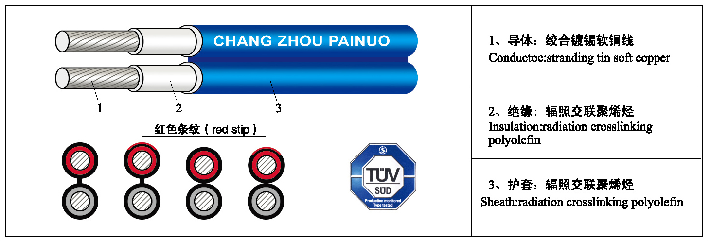 印字(zi) MARKING PV1-F 2*()mm2 CHANG ZHOU PAINUO ELECTRON CO.,LTD. TÜV SÜD approved VDE-AR-E 2283-4:2011-10 |